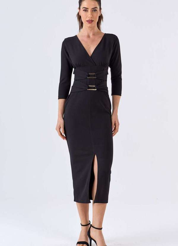 Vestido confeccionado em malha crepe encorpada com elastano na cor preto, com ótima elasticidade, que não marca ao vestir, não apresenta transparência e não amassa com facilidade. Possui modelagem justa ao corpo, decote V, sem bojo, mangas 7/8, detalhe de transpasse na cintura com fivelas douradas, comprimento midi, fenda frontal, fechamento costas com zíper invisível e acabamento pespontado. Peça perfeita para destacar e elevar a feminilidade do look, sendo uma ótima opção para produções elegantes em ocasiões especiais. A fenda frontal e o detalhe de argolas proporcionam um acabamento moderno e estiloso. Aposte em um visual all black com esse midi e garanta uma produção sofisticada e marcante!