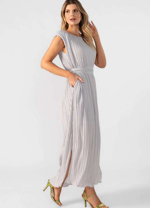 Lamis - Vestido Midi Plissado com Ombreiras Cinza
