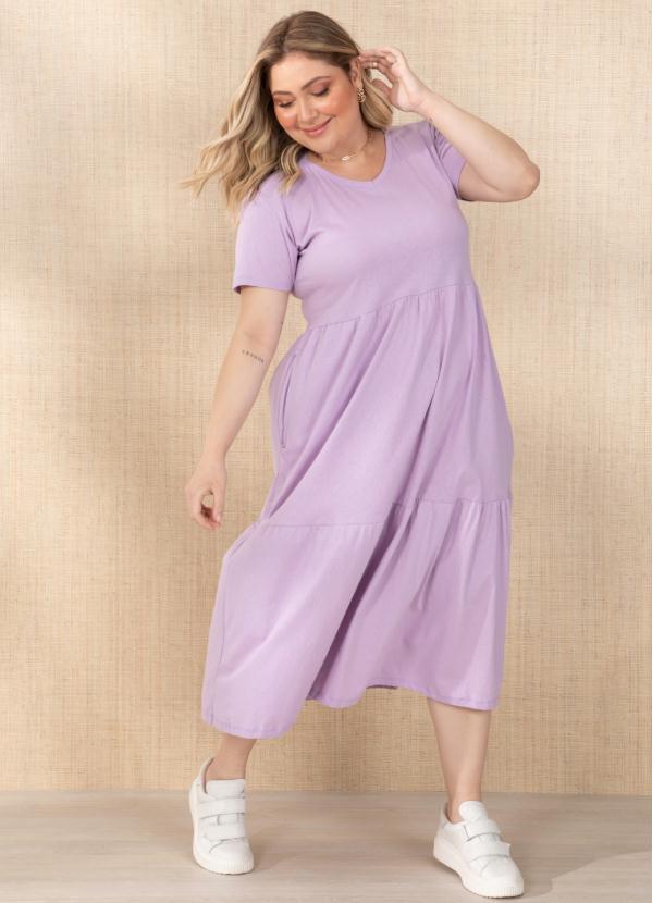 Quintess - Vestido Midi Soltinho Lilás Decote V e Bolsos