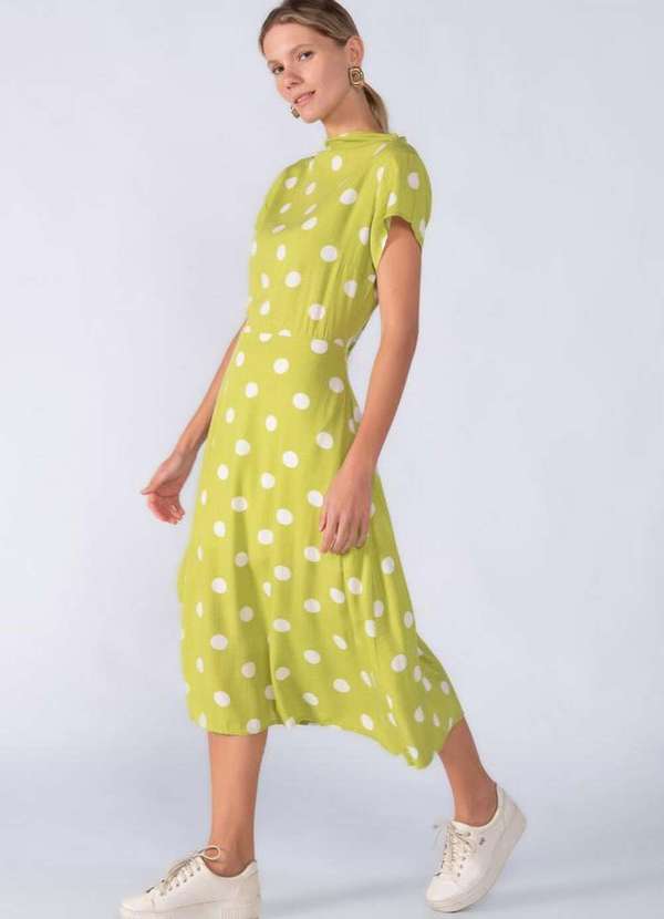 Lamis - Vestido Midi Viscose Evase Poa com Gola Verde
