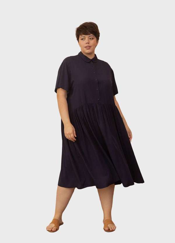 Vestido em viscose plus size, Modelagem ampla. Comprimento midi. Fechamento por botões. Gola boneca. Detalhe franzido abaixo do busto. Bolsos nas laterais. Observação: Essa peça passou por processo de lavagem e não sofrerá encolhimento. Sugerimos lavar essa peça em água fria e à mão. Se optar pela máquina, use o modo delicado. Isso irá garantir bons resultados finais e uma maior durabilidade da sua peça. Não usar secadora. Não aceitamos devoluções de peças usadas. Medidas: G equivale 46-50 GG equivale 50-54 EXG equivale 54-58 Busto 132cm 140cm 148cm Cintura 132cm 140cm 148cm Quadril 192cm 200cm 208cm Largura da Manga 46cm 50cm 54cm Comprimento 118cm 120cm 122cm