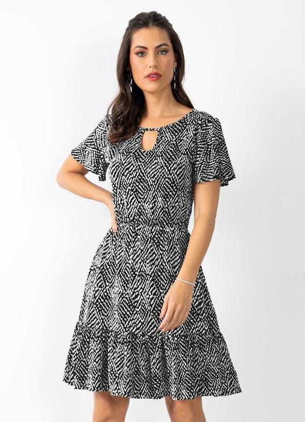 Quintess - Vestido Poá Abstrato Curto com Babado na Barra