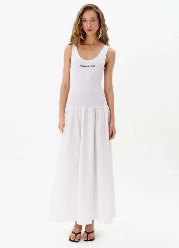 o vestido super midi com caimento amplo e fluido é perfeito para um look prático e fashion. Conta com alças, decote redondo e bordado minimalista.
