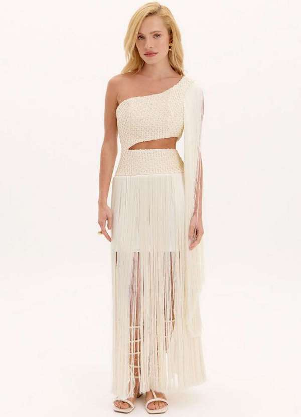 modelagem: super midi caimento: justo estilo de gola/decote: ombro único o vestido super midi é a definição perfeita de autenticidade. Suas franjas conferem movimento, enquanto os recortes estratégicos inspiram ousadia!