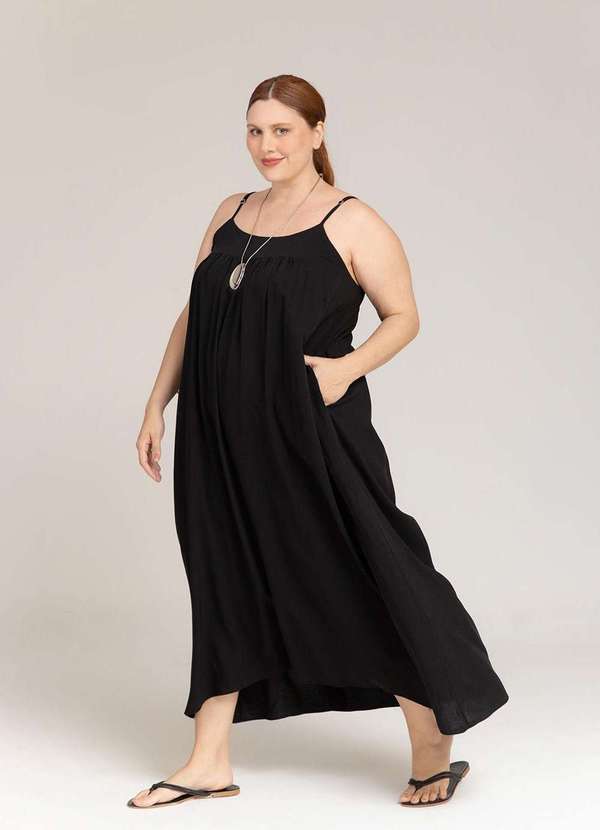 Vestido plus size em viscose. Modelagem evasê. Comprimento longo. Alças finas com regulador. Bolsos nas laterais. Observação: Essa peça passou por processo de lavagem e não sofrerá encolhimento. Sugerimos lavar essa peça em água fria e à mão. Se optar pela máquina, use o modo delicado. Isso irá garantir bons resultados finais e uma maior durabilidade da sua peça. Não usar secadora. Não aceitamos devoluções de peças usadas. Medidas: G equivale 48-50 GG equivale 52-54 EXG equivale 56-58 Busto 124-134cm 132-142cm 140-150cm Cintura 140cm 148cm 156cm Quadril 180cm 188cm 196cm Comprimento 136cm 138cm 140cm