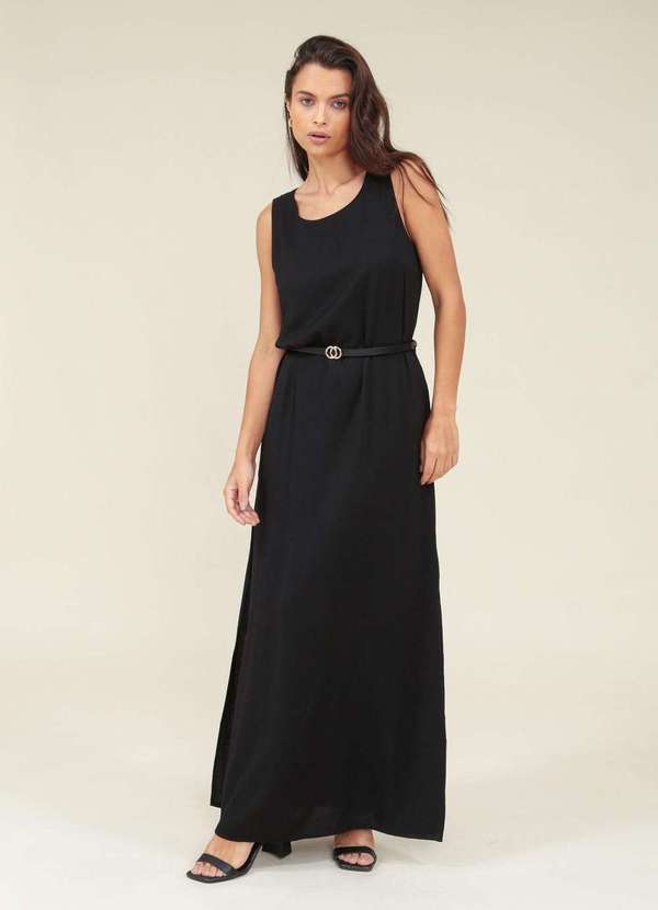 Pop Me - Vestido Viscolinho Longo sem Manga com Cinto Preto