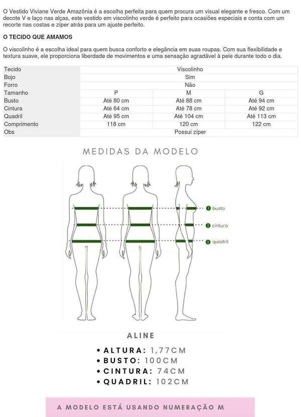 O Vestido Viviane Verde Amazônia é a escolha perfeita para quem procura um visual elegante e fresco. Com um decote V e laço nas alças, este vestido em viscolinho verde é perfeito para ocasiões especiais e conta com um recorte nas costas e zíper atrás para um ajuste perfeito. O TECIDO QUE AMAMOS O viscolinho é a escolha ideal para quem busca conforto e elegância em suas roupas. Com sua flexibilidade e textura suave, ele proporciona liberdade de movimentos e uma sensação agradável à pele durante todo o dia. Tecido Viscolinho Bojo Sim Forro Não Tamanho P M G Busto Até 80 cm Até 88 cm Até 94 cm Cintura Até 64 cm Até 78 cm Até 92 cm Quadril Até 95 cm Até 104 cm Até 113 cm Comprimento 118 cm 120 cm 122 cm Obs Possui zíper