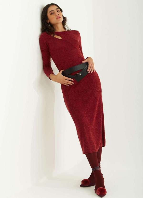 Zinco - Vestido Zinco Ajustado Decote Careca Manga Longa Midi Bordo Vermelho